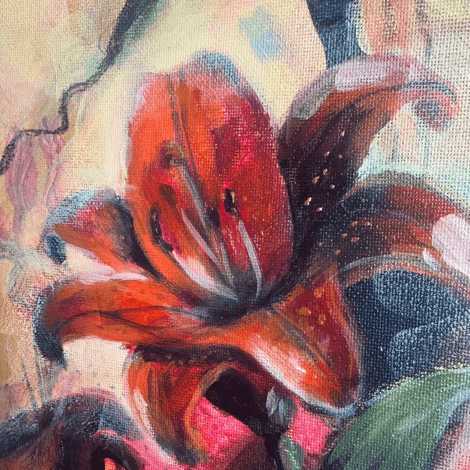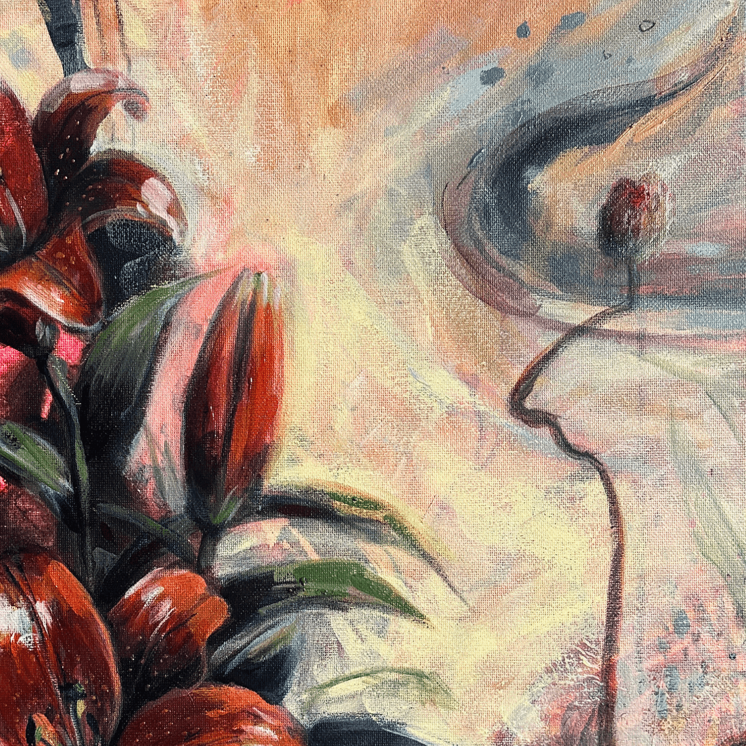 This piece carries that same warmth - a sun-soaked palette, rich textures and a sense of heat that feels alive rather than overwhelming. There’s an iris collage subtly glazed into the background, adding another layer of depth and quiet detail beneath the surface.